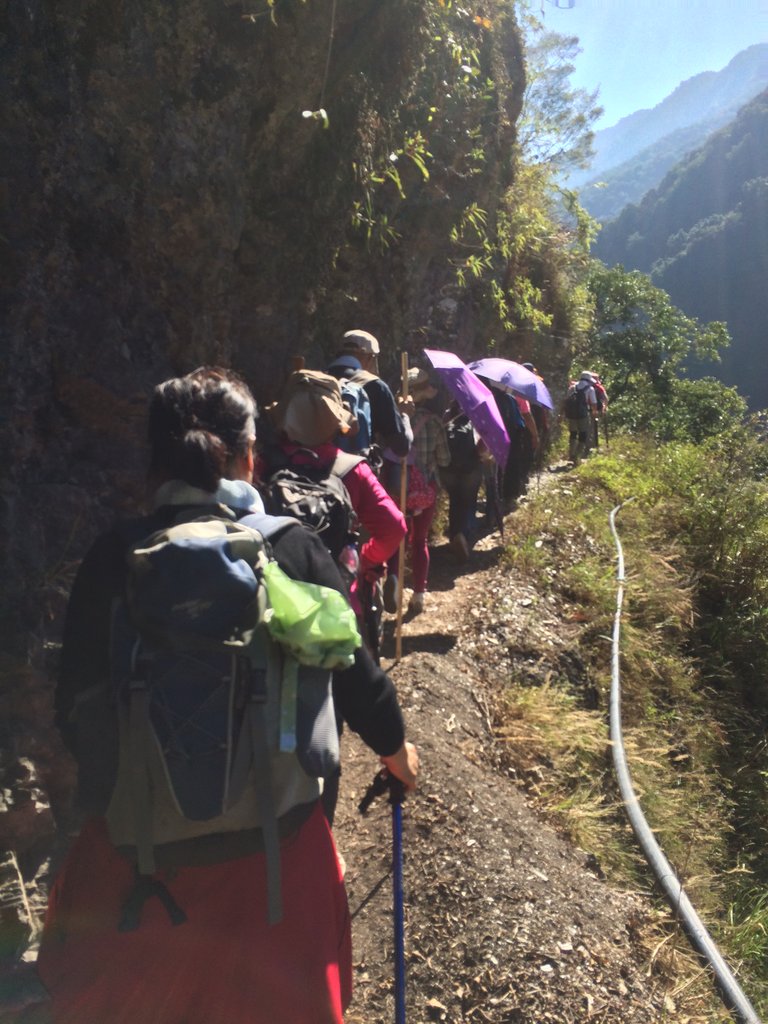 Cũng khá nguy hiểm nhưng so với núi Yushan thì cũng không là gì. Mình đã trải qua nên thấy cùng bình thường, chỉ cần cẩn thận thôi. Trên đường đi cũng ngắm và chụp cảnh nhiều. Trên đoạn đi có một khúc mình gặp được một đoàn các bác trung, cao niên. Đường đã nhỏ rồi, các bác hàng dài nữa chứ. Mình muốn đi nhanh nhưng các bác không đi nhanh được. Thế là mình cứ xin phép từng người để đi qua. Nhiều lúc sợ đụng người các bác, mình cứ phóng bay qua trên con đường hẹp đó. Lỡ mà đất lở là không có cám mà ăn… Các bác cũng sợ, nhắc mình cẩn thận.