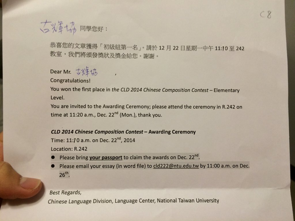 It’s so pleased, grateful and especially motivating to receive this letter knowing that I eventually won the first prize on essay competition in elementary level (I just started to study Chinese for 4 months from ZERO).