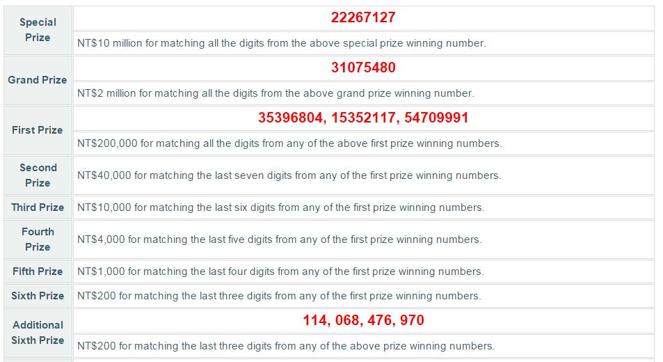 Cứ mỗi hai tháng một lần (tháng 1,3,5,7,9,11) , vào ngày 25, những chuỗi số gồm 8 con số sẽ được rút ngẫu nhiên và thông báo trên trang http://invoice.etax.nat.gov.tw/